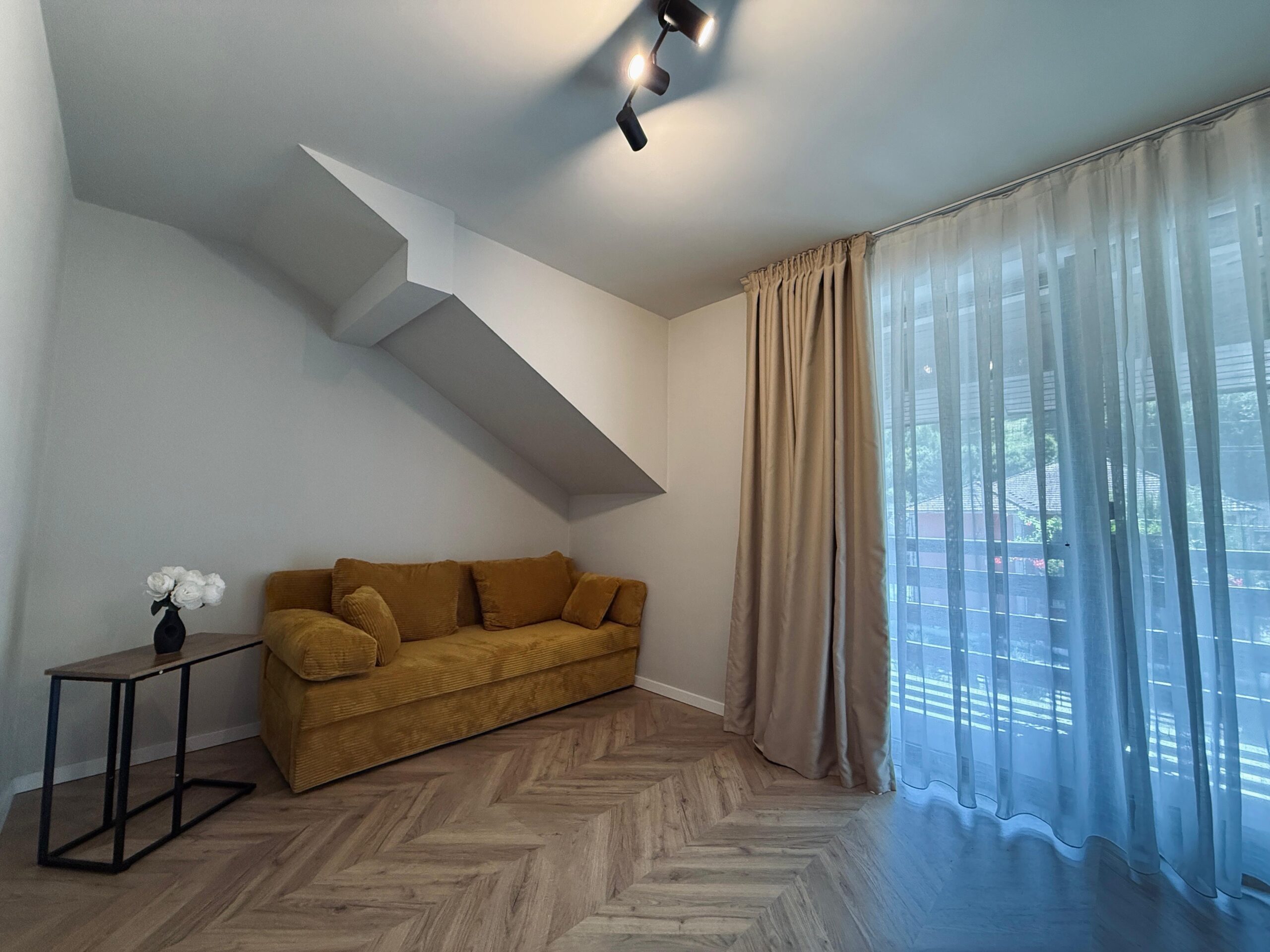 Dormitorul dispune de un pat matrimonial confortabil, iar livingul separat adaugă un plus de intimitate și funcționalitate. Canapeaua extensibilă oferă spațiu suplimentar pentru familie sau prieteni.