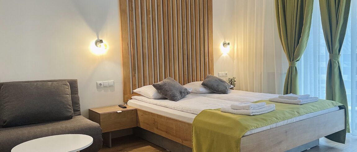 Dormitorul dispune de un pat matrimonial confortabil, iar fotoliul adaugă o notă practică pentru momentele de odihnă. Balconul privat oferă un spațiu unde te poți relaxa, savurând aerul proaspăt de munte și atmosfera autentică a locului.